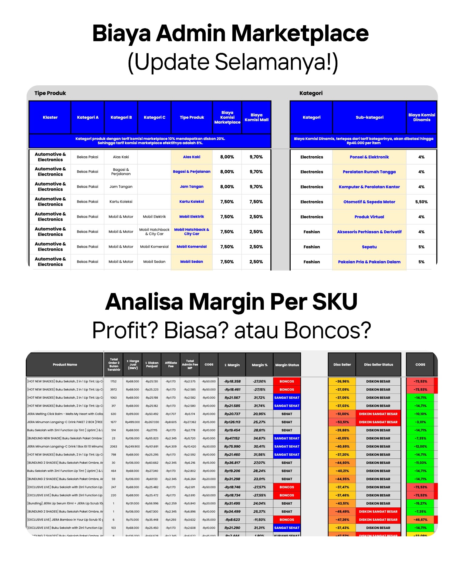 - Database Biaya Admin Marketplace (Update Selamanya) — barometer fee & komisi yang selalu berubah di Shopee/TikTok, jadi perhitungan kamu tetap relevan dan up to date.