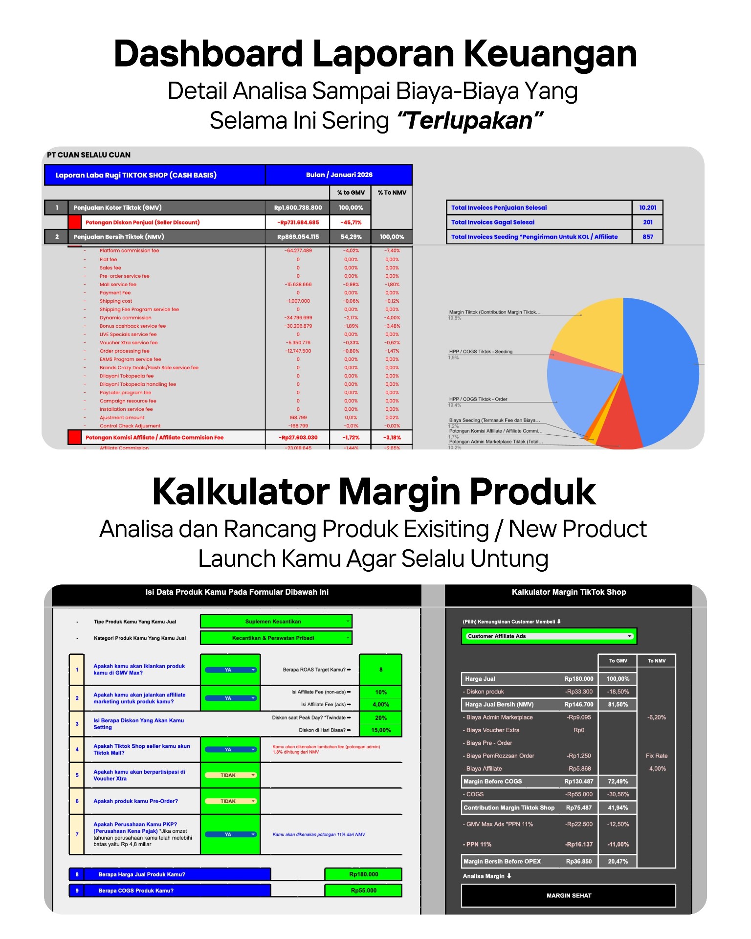 - Kontrol biaya marketing & promosi — bantu ngukur impact affiliate, ads, voucher, dan program marketplace ke profit (bukan cuma liat GMV).